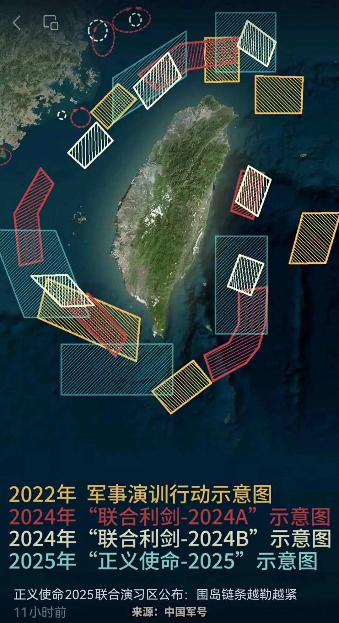 12月29日开始,中国人民解放军东部战区组织陆军、海军、空军、火箭军等兵力,位台湾海峡、台岛北部、台岛西南、台岛东南、台岛以东,组织“正义使命-2025”演习。