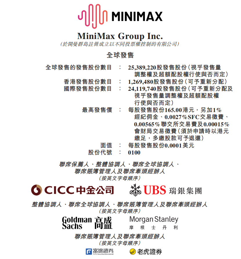 根据招股书披露的核心细节,MiniMax 本次 IPO 拟发行 25,389,220 股,定价区间为 151 至 165 港元/股,在不考虑发售量调整权及超额配股权行使的情况下,发行估值将介于 461.23 亿港元至 503.99 亿港元之间。