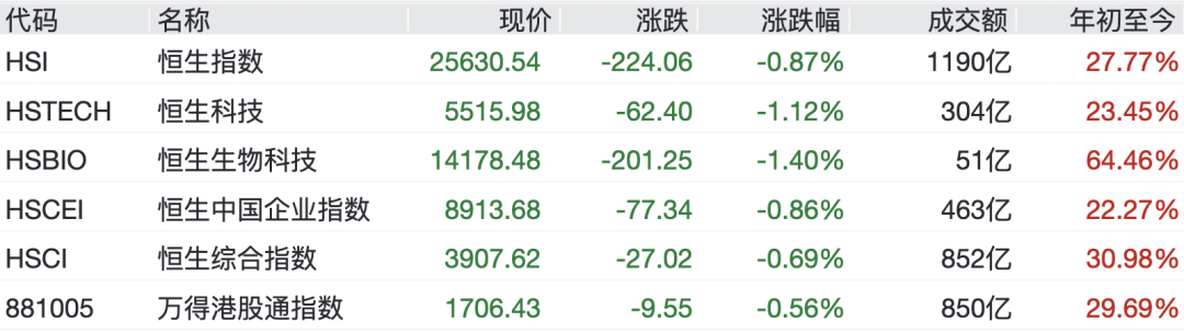 12月31日,港股因元旦假期提前收市,恒指收跌0.87%,恒生科技指数跌1.12%。医疗、金融、消费行业跌幅居前,有色股逆势飘红。