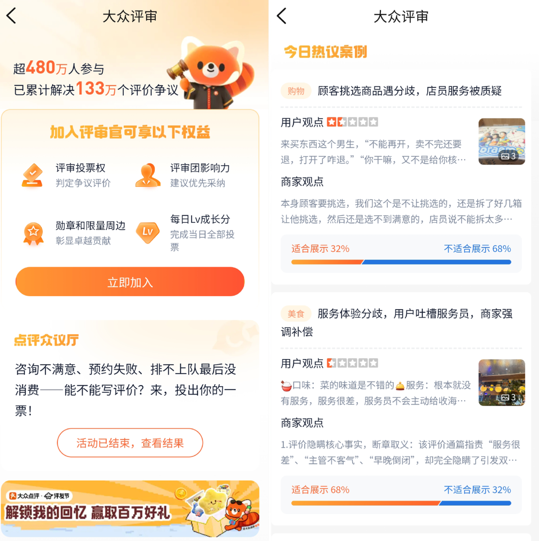 大众评审:引入公众智慧,公开评判复杂争议性评价。引入大众评审机制,调动公众智慧,公开评判复杂争议性评价。经严格筛选、具备资质的评审官,将基于双方举证进行投票裁决,更公开、更透明。目前,该工具已有超480万人参与,累计解决133万个评价争议。