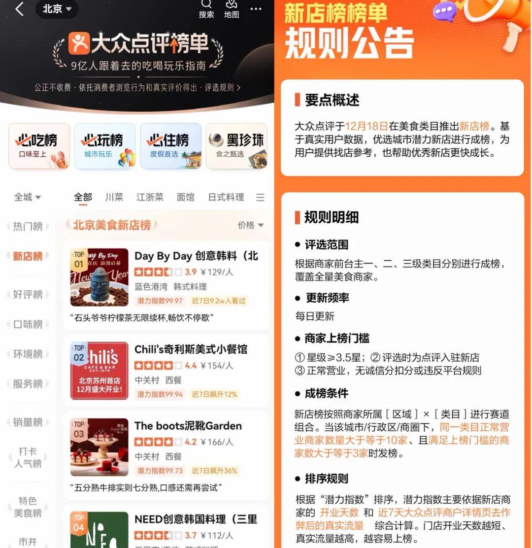为了更好扶持新店商家,12月18日大众点评还在美食类目推出了新店榜,将根据新店商家的开业天数和近7天大众点评商户详情页去除作弊行为后的真实流量综合计算得出的“潜力指数”进行评判,帮助优秀新店更快成长。“门店开业天数越短,真实流量越高,越容易上榜。”大众点评星级评价部负责人表示。