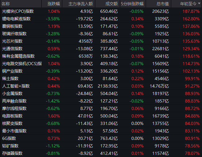 包括CPO光模块、锂电、玻璃纤维、覆铜板、光芯片、光通信、稀有金 属、OCS光电路交换机、铜和稀土。