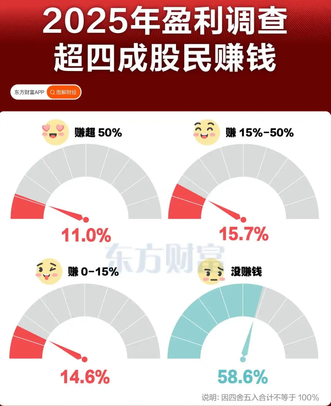 15.7%的股民赚15%-50%;约14.6 %的股民赚不到15个点。