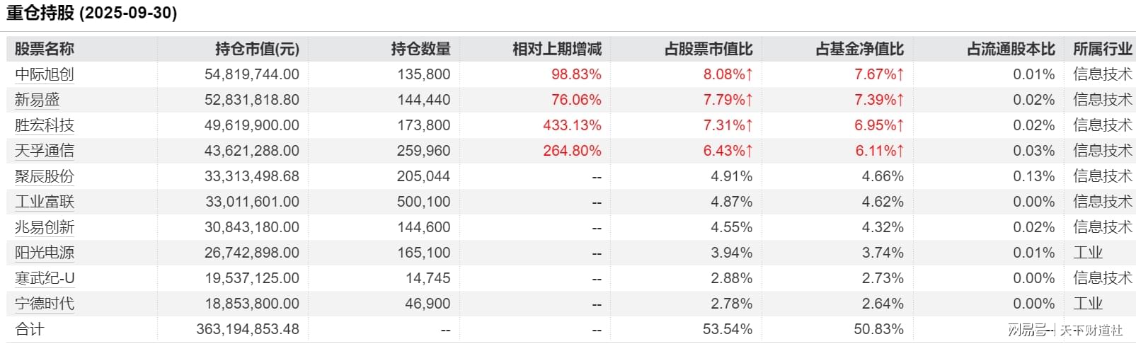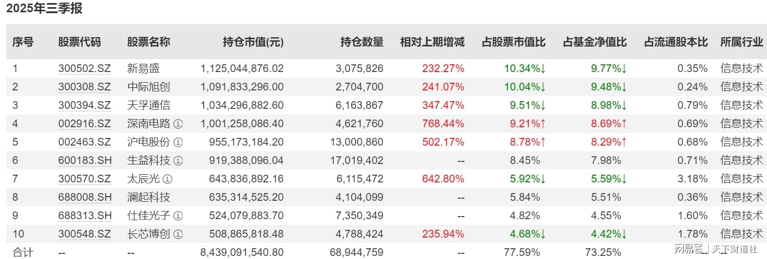 2025年二季度该基金大幅调仓换股,新进“易中天”,三季度又新进寒武纪、工业富联,重仓股中几乎都是热门牛股,一番操作后基金业绩飙升。