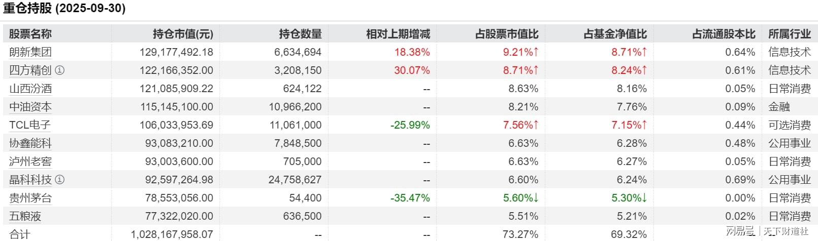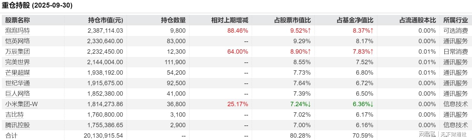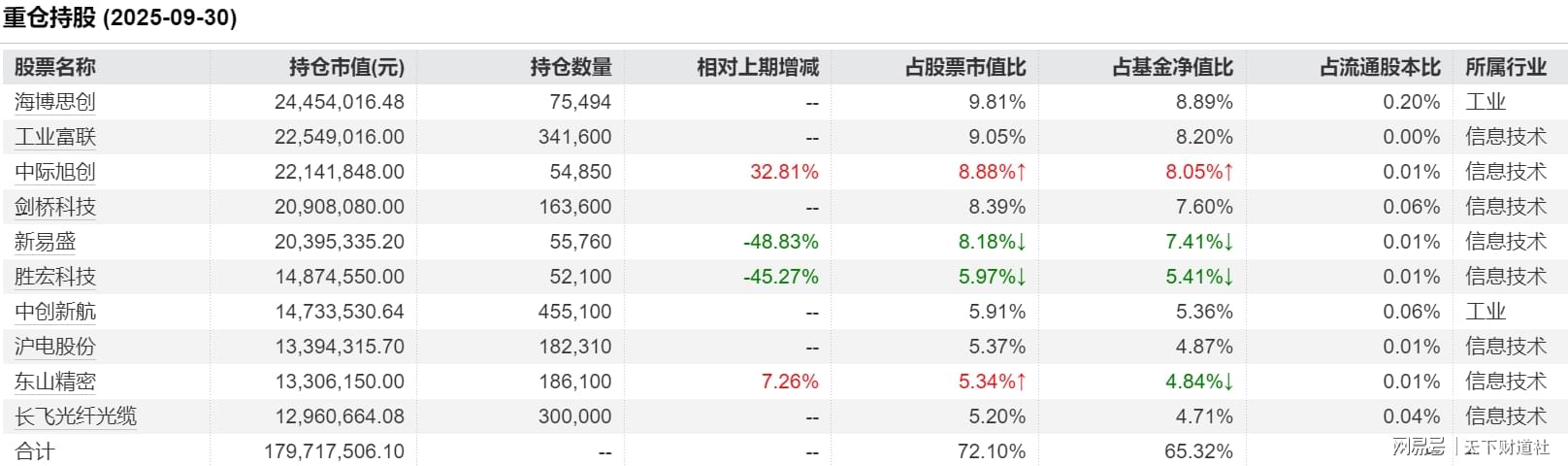 与一些基金2025年二季度换入热门股不同,中航机遇领航A自成立便一直持有“易中天”,体现出基金经理对AI算力概念持续看好,并最终等来收获期。同时,该基金持股集中度较高,三季度末十大重仓股占基金净值比达77%,风格偏于激进,在牛市中进攻性更强。