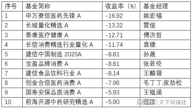 反观业绩后十名产品,有4只年度跌幅超过10%,包括申万菱信医药先锋A、长城量化精选A、泰康医疗健康A、长信消费精选行业量化A,多是重仓医药、白酒行业的基金。