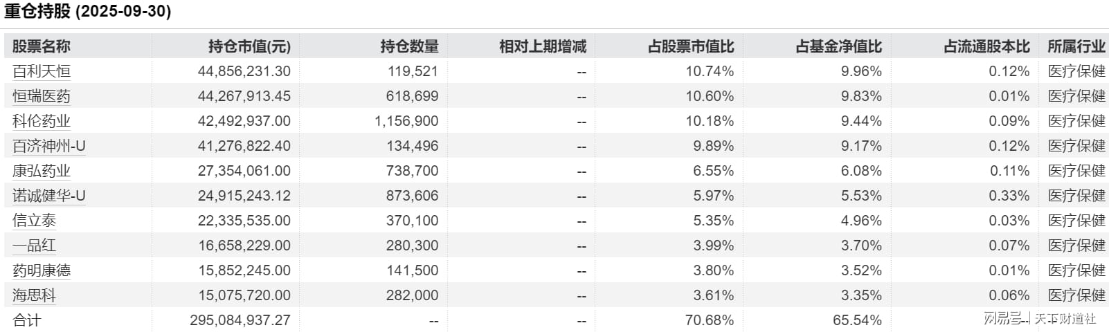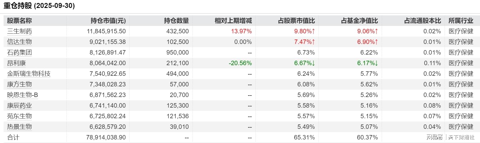 2025年三季度,该基金在更换基金经理后画风突变,重仓股全部更换为医疗保健行业个股。