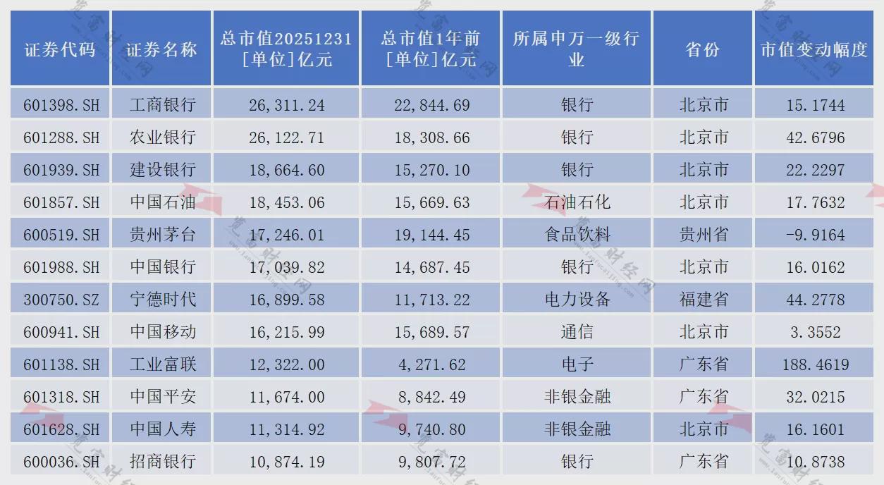 截至2025年最后一个交易日,总市值超1万亿元的企业有12家,较2024年(8家)增长50%。