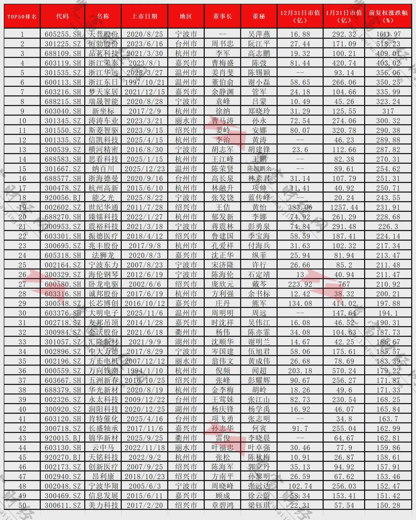 2025年浙江省A股上市公司涨幅前TOP50排行:
