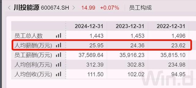 川投能源员工就不多,利润如此丰厚,人效就高得惊人。2024年末,川投能源只有1400余人,去年人均创利超过312万元,比2023年增加约10万元;人均税前薪酬大约26万元,比2023年增加1.6万元。