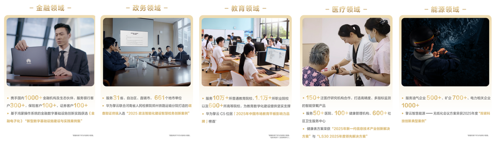 在极度讲求安全稳定的能源领域,华为擎云已累计服务超过700家矿企、上千家电力企业;携手国内 1000+金融机构及生态伙伴,服务银行客户 300+、保险客户100+、证券客户 100+;在教育领域已服务超过10万所普教院校、1.1万余所职业院校以及600多所高等院校,为教育数字化建设提供坚实支撑。
