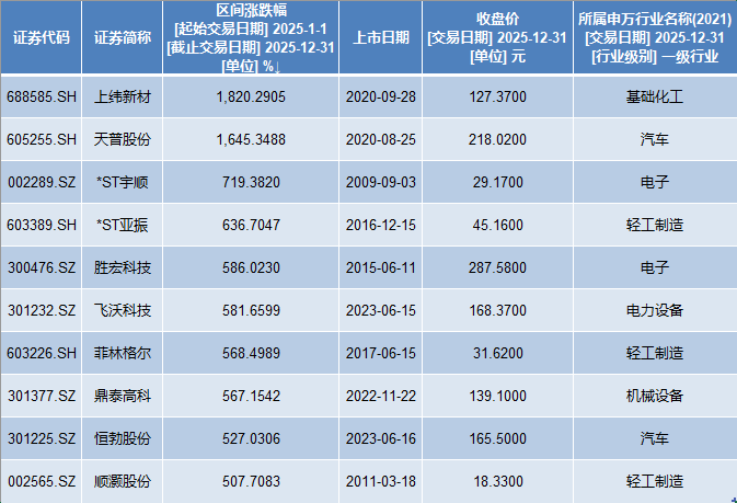 排名方面,上纬新材(688585)全年涨幅位居第一,高达1820.29%。