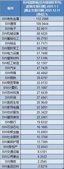 具体来看,有色金属板块2025年领涨所有板块,板块年度涨幅超过100%,高达112.30%。通信板块紧随其后,2025年全年涨幅同样超过100%,合计上涨了109.94%。