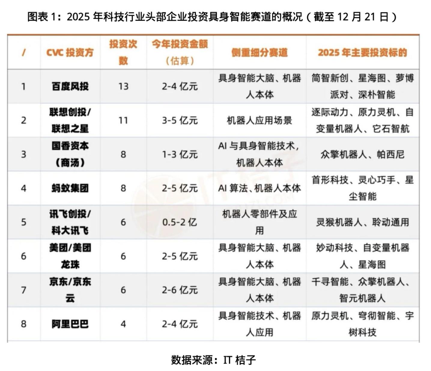 同时,腾讯、阿里、美团、京东、百度等互联网大厂强势入局,在具身智能赛道密集出手。据IT桔子数据,科技行业8家头部企业2025年的投资次数合计达62次,成为该赛道的重要推手。从国家级产业基金到地方资本,从风险投资到互联网巨头,一场围绕“智能实体”的资本盛宴已然开席。