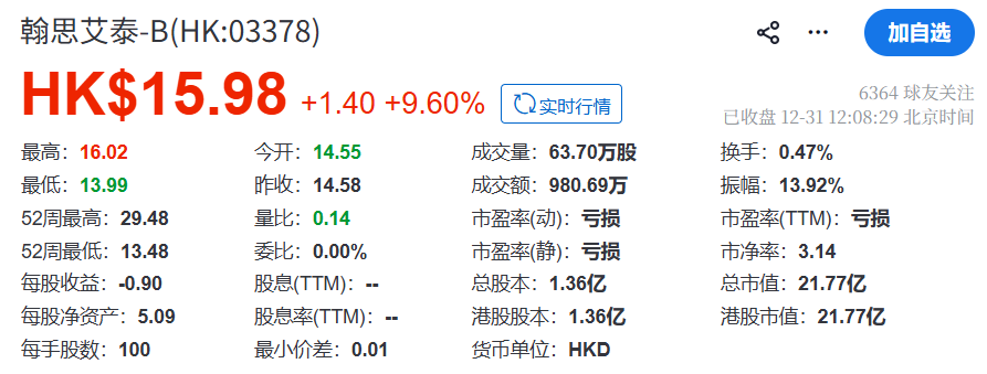 今年的最后半个交易日,翰思艾泰股价报15.98港元/股,上涨9.60%,总市值21.77亿港元。