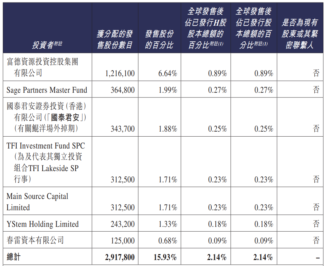 基石阵容包括富德资源、锐智资本、国泰君安、TFI Investment、Main Source Capital、YStem Holding及春雷资本。