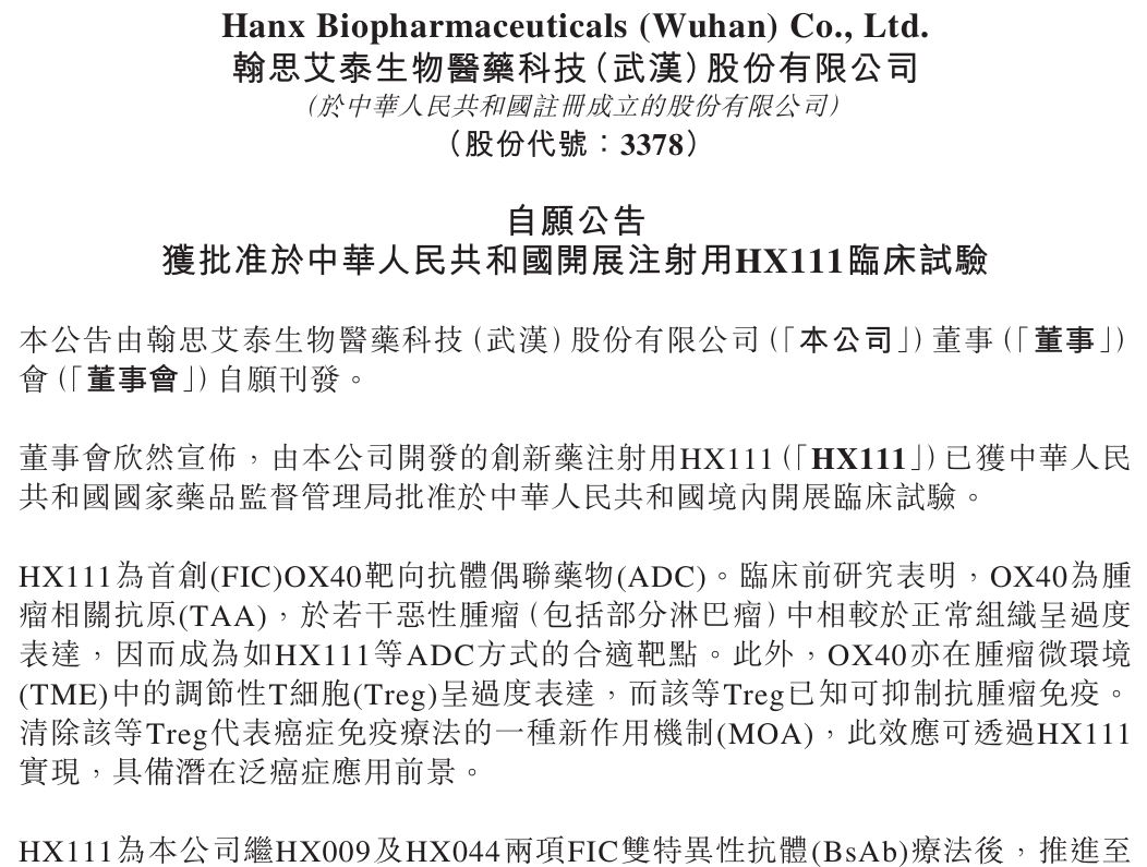 值得注意的是,翰思艾泰还于12月23日晚间公告称,其创新药注射用HX111已获国家药监局批准在境内开展临床试验。