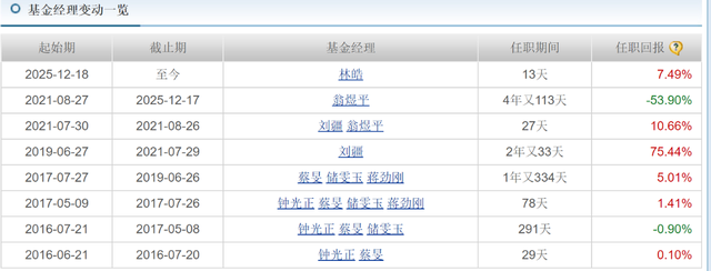 再比如管理5只产品的基金经理廖瀚博,他管理的5只产品中,有2只基金任职回报负收益,管理时长都超过了3年。