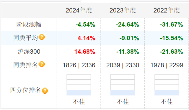 分阶段来看,长城久源混合在完整的2022年至2024年的3年,该基金年度收益分别为-31.67%、-24.64%、-4.54%,连续三年跑输沪深300指数和同类平均。