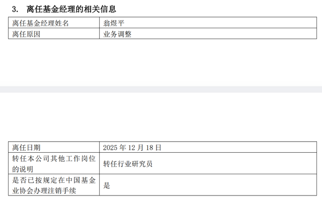 通常基金经理卸任大部分是因个人原因从公司离职,而翁煜平有所不同,他卸任的原因是业务调整,具体情况为转任公司行业研究员,并且已经在中国基金业协会办理了注销基金经理的手续。