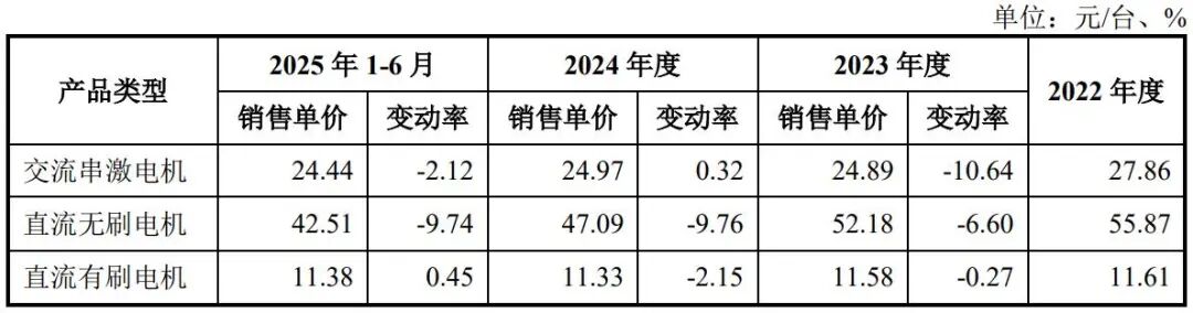 不过,《招股书》显示,晨光电机近年来主要产品的销售单价呈下降趋势。其中,交流串激电机的销售单价从2022年的27.86元/台降至2025年上半年的24.44元/台,直流无刷电机的销售单价则从55.87元/台降至42.51元/台。