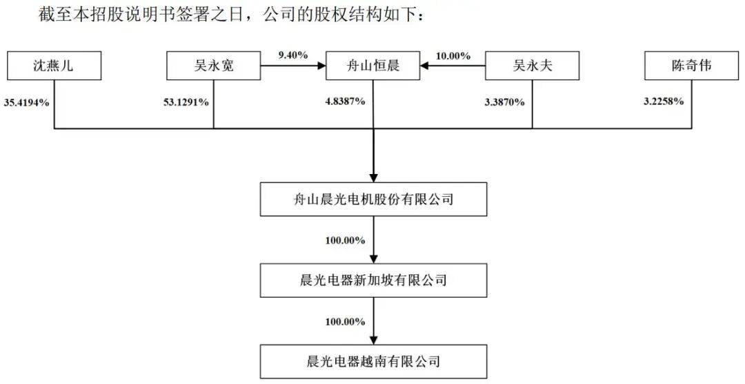 截至目前,吴永宽任晨光电机的董事长兼总经理,直接持股53.13%,并通过员工持股平台舟山恒晨间接控股4.84%,是控股股东;沈燕儿则任公司董事,直接持股35.42%;夫妇二人合计控股93.39%,是公司实控人。