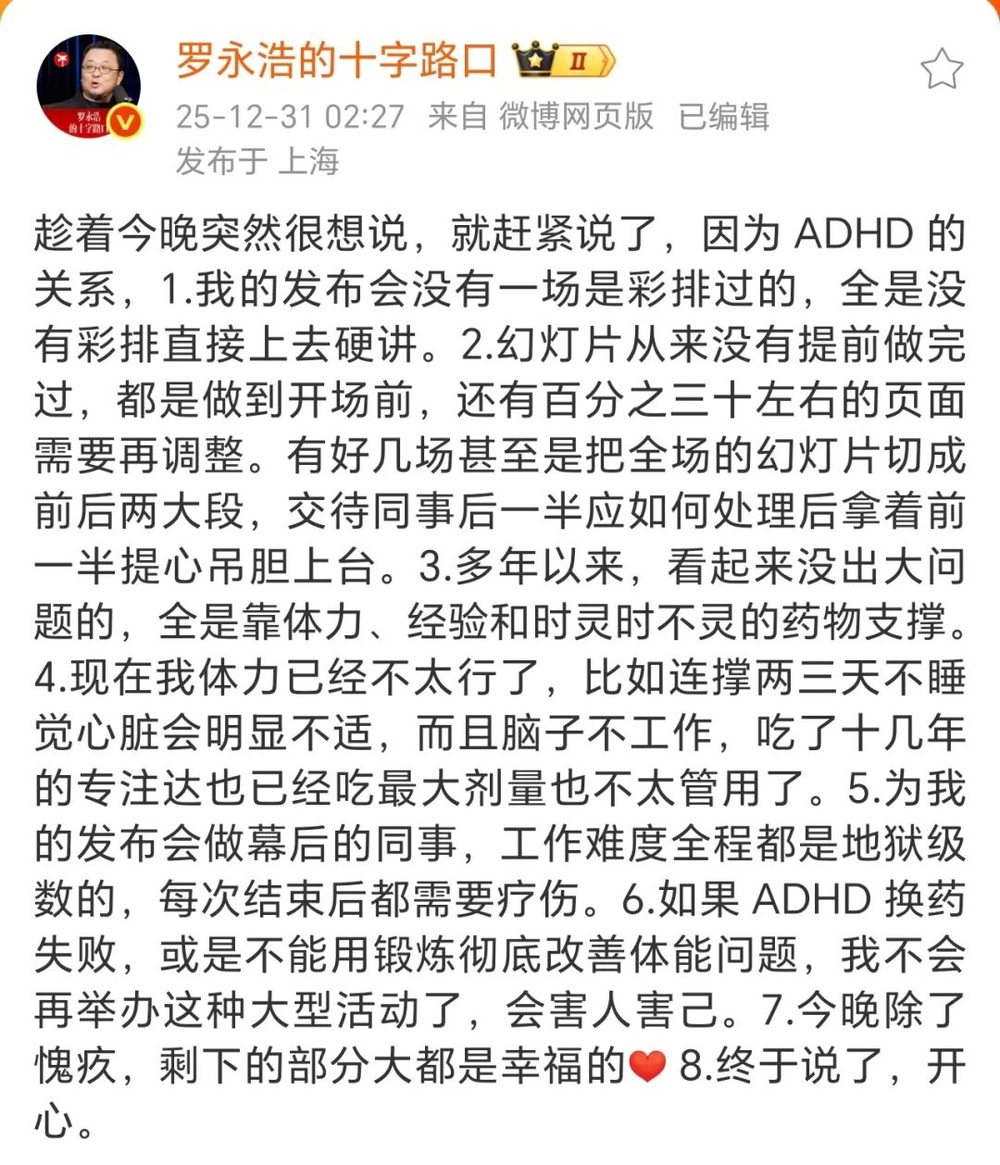 大概意思是,迟到和发布会稀碎之类的问题,都是ADHD的锅,加上岁数大了,人也不灵了,药也不灵了,所以“李姐万岁”吧。