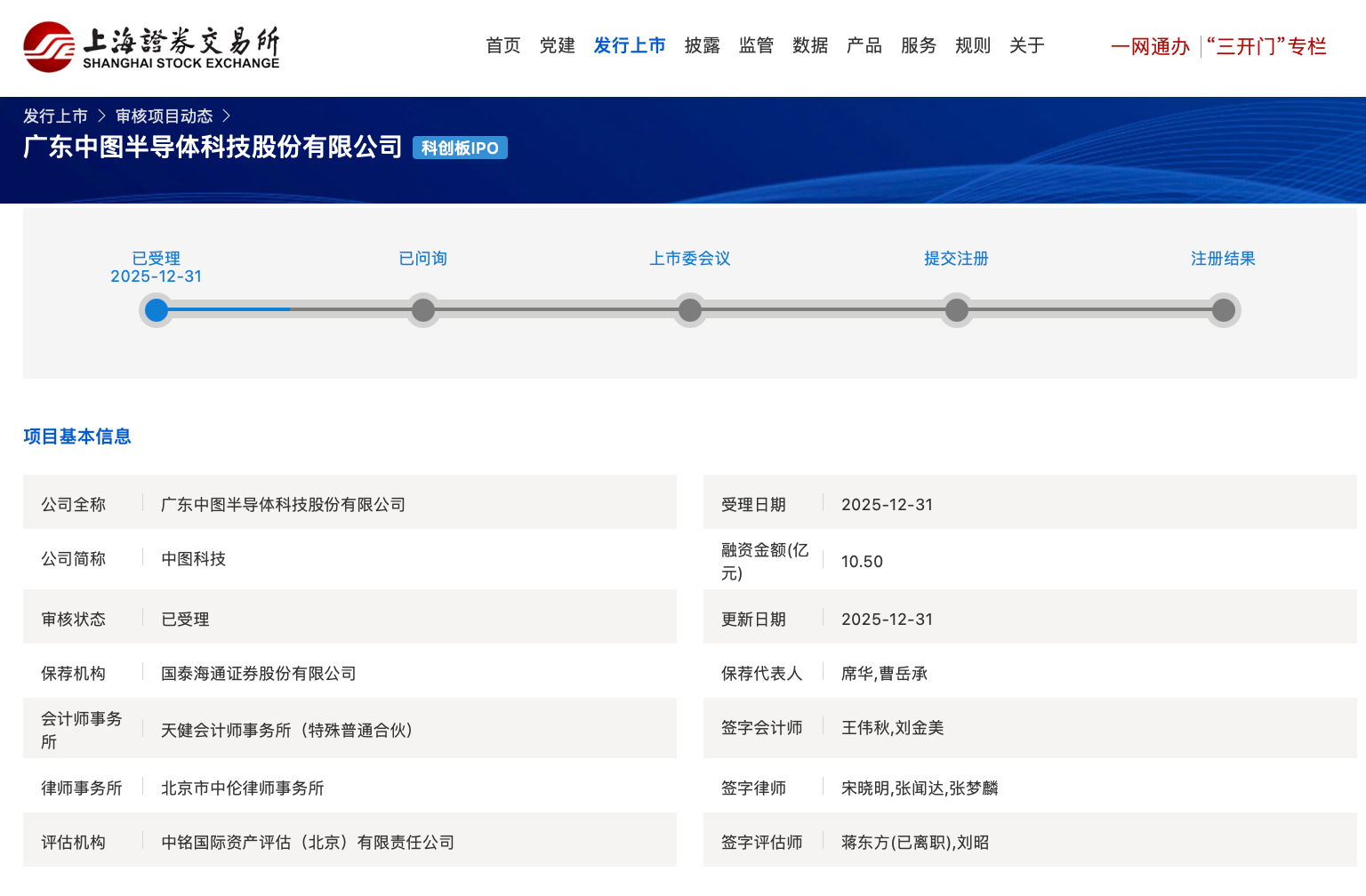 2025年12月31日,上海证券交易所官网显示,广东中图半导体科技股份有限公司(以下简称“中图科技”)科创板IPO获得受理。