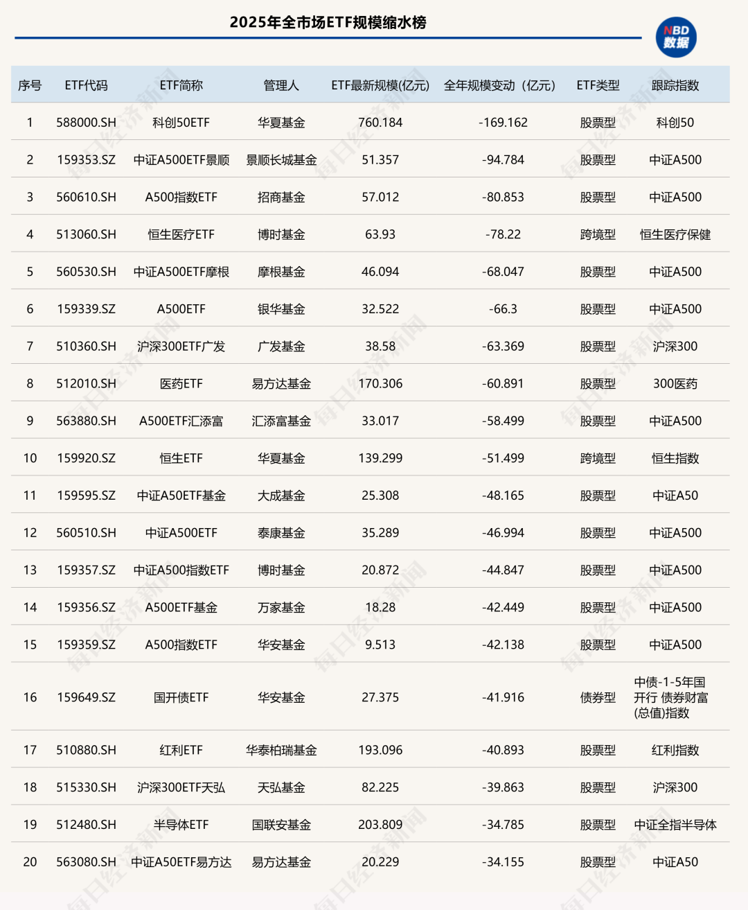 排在榜首的是华夏基金旗下科创50ETF,2025年全年规模缩水169.16亿元,也是唯一缩水超百亿元的产品。此外,景顺长城旗下中证A500ETF和招商基金旗下A500指数ETF均缩水超80亿元,规模也从百亿元上方回落至50亿元级别。