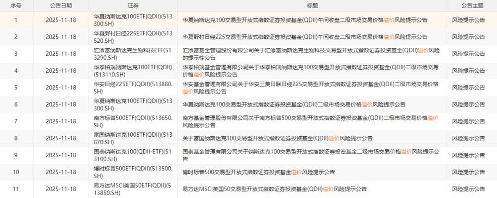 而11月开始,A股面临回调压力,境外ETF再受青睐,一个月内机构关于高溢价风险提示的公告就达上百条。