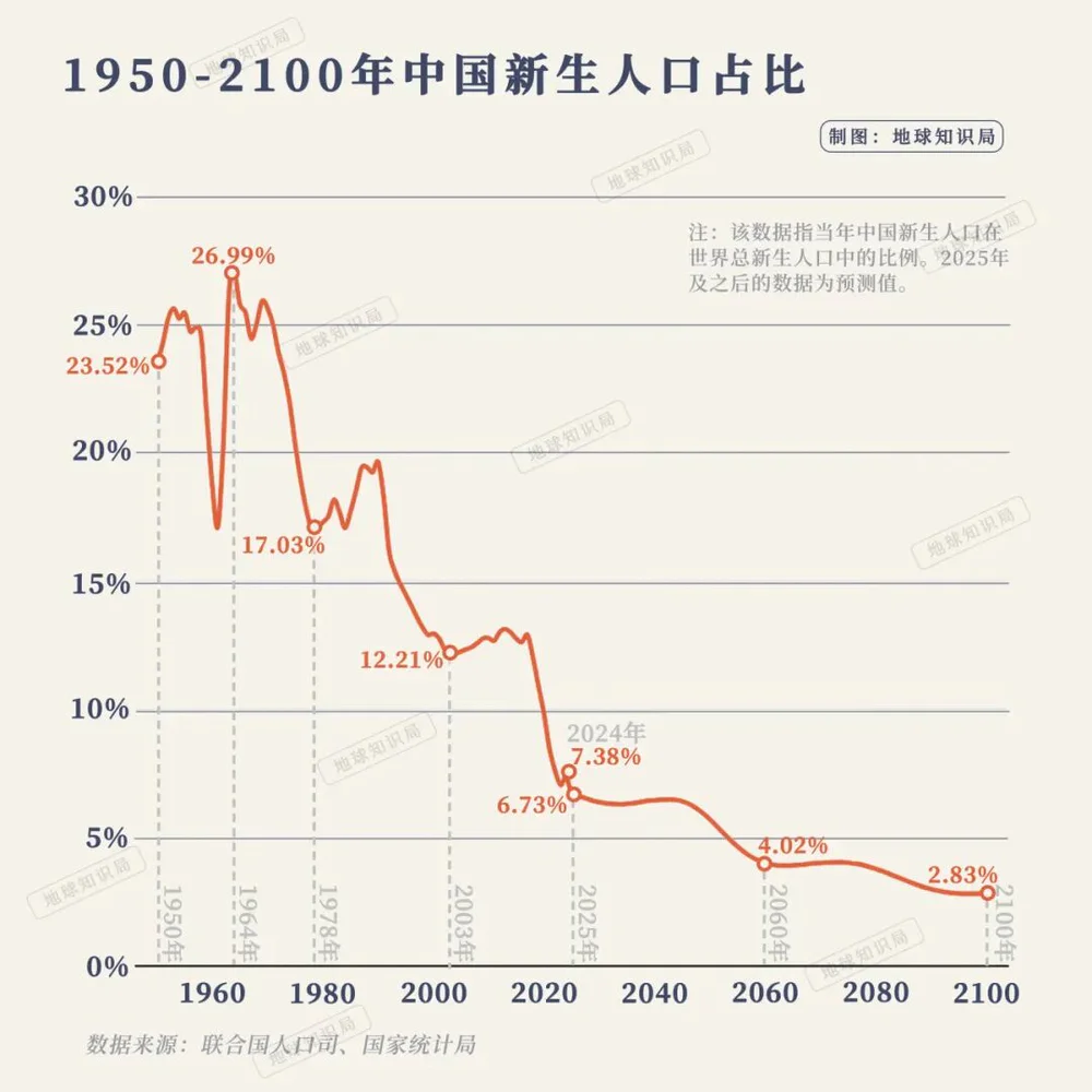 最近联合国人口司发了组数字:他们预测2025年中国新生儿可能只有871万左右。也就是说,中国新生人口占全球总出生人口的比例,要掉到7%以下了。