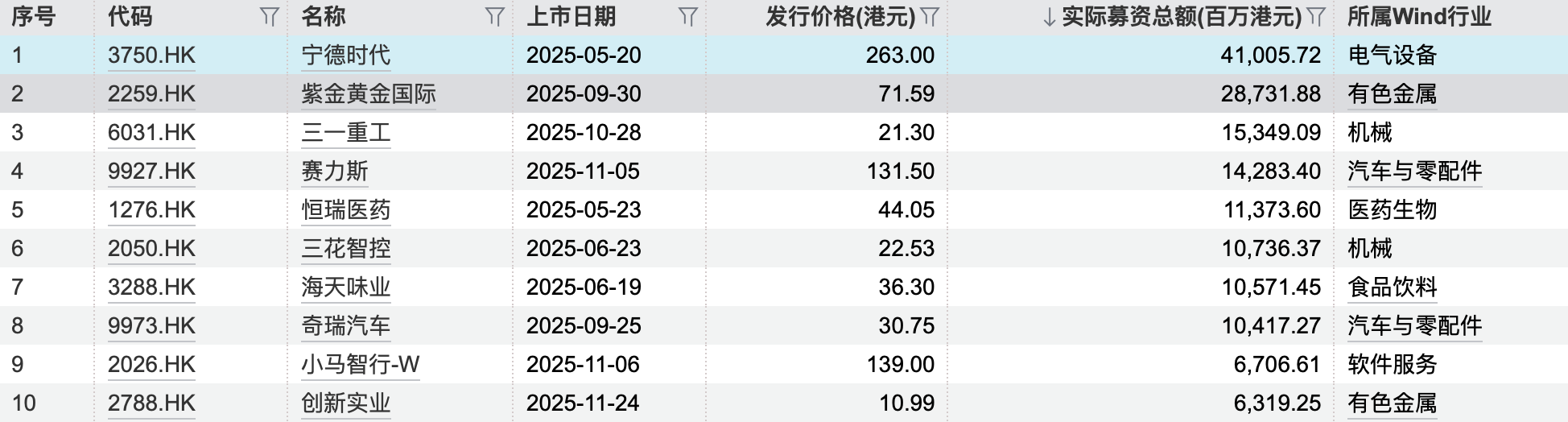 这一成绩的达成,核心依托超大型IPO的强劲拉动,港股市场2025年全年诞生8家百亿级港元融资企业,分别为宁德时代(410.06亿港元)、紫金黄金国际(287.32亿港元)、三一重工(153.49亿港元)、赛力斯(142.83亿港元)、恒瑞医药(113.74亿港元)、三花智控(107.36亿港元)、海天味业(105.71亿港元)、奇瑞汽车(104.17亿港元)。这8家企业合计募资达1424.69亿港元,占全年募资总额的52.75%,头部效应显著,成为港股IPO市场复苏的“压舱石”。