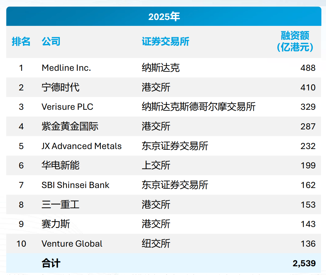 不仅如此,根据德勤统计的数据,在2025年全球十大新股榜单中,港交所新股占据了四个席位,其中宁德时代以410.06亿港元的募资金额位列全球第二;紫金黄金国际、三一重工、赛力斯的融资规模则分别位列全球新股的第四、第八、第九位。