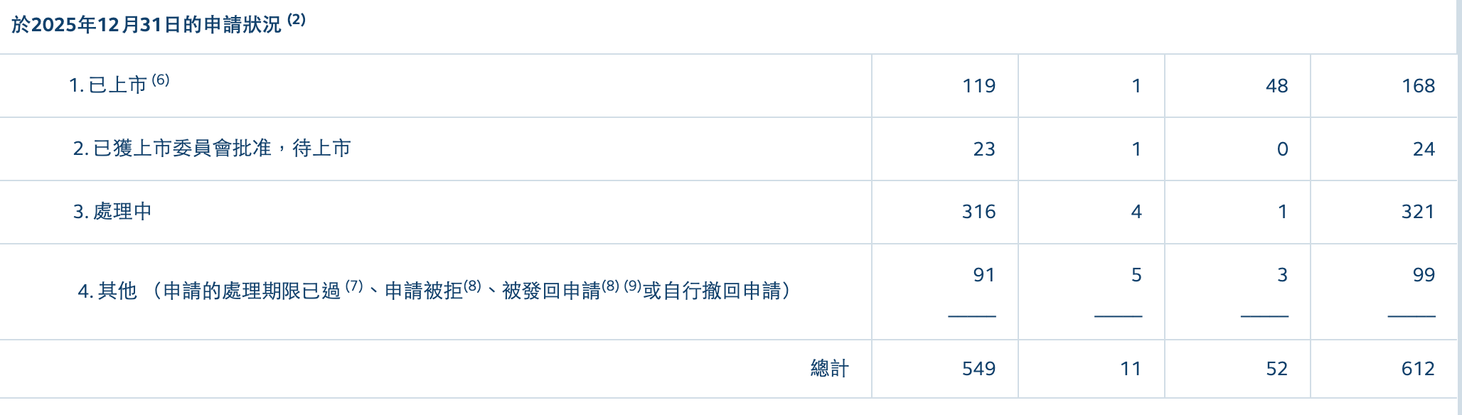 港交所数据显示,截至2025年12月31日,共有逾612宗上市申请,其中包括549家主板、11家GEM(原创业板),还有52家根据《主板上市规则》第二十章及第二十一章递交的上市申请,仍在排队处理的还有321宗。