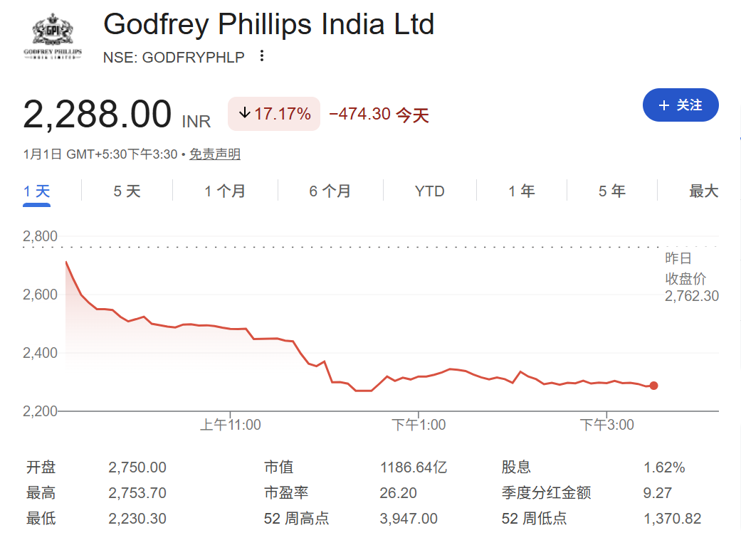 行业龙头、生产“Gold Flake”等品牌的ITC股价下跌9.7%,在印度负责“万宝路”分销的Godfrey Phillips India暴跌17%。