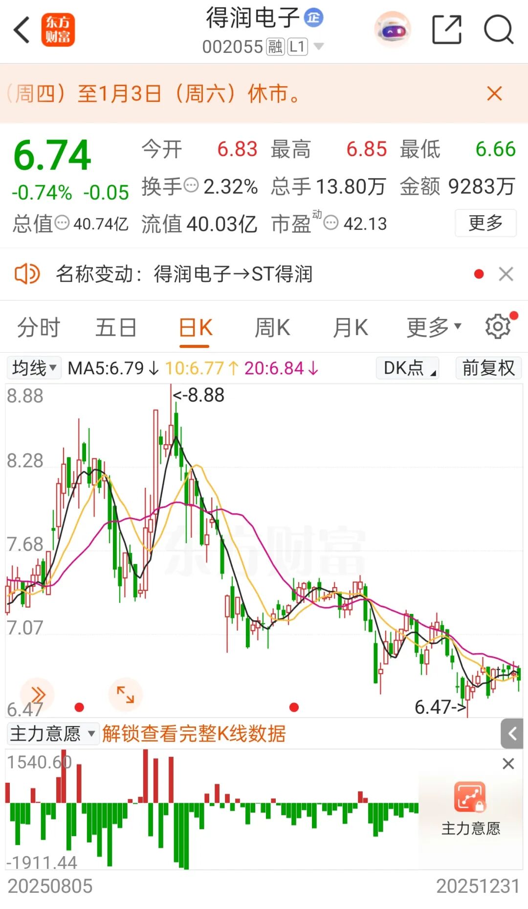 根据公告,深交所将对公司股票实施其他风险警示,股票简称由“得润电子”变更为“ST得润”;股票代码不变,仍为“002055”;股票交易日涨跌幅限制为5%。公司股票将自2026年1月5日(星期一)开市起停牌1天,自2026年1月6日(星期二)开市起复牌。
