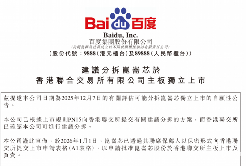 1月2日,百度发布公告,其附属公司昆仑芯已于1月1日透过其联席保荐人以保密形式向港交所提交上市申请表格,以申请批准昆仑芯股份于港交所主上市。