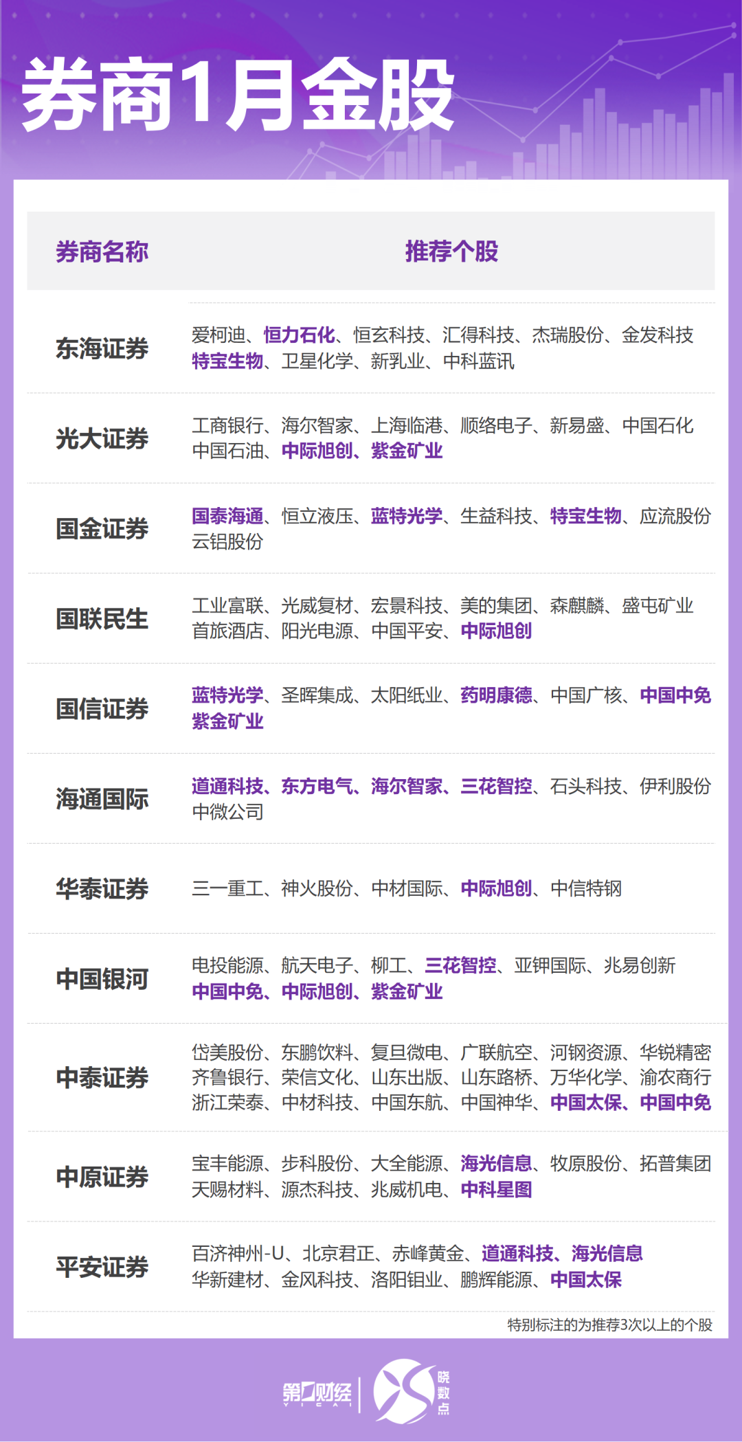 据不完全统计,在各家券商的“金股”名单中,获机构推荐次数最多的是中际旭创,共获得5家券商的推荐,中国中免、紫金矿业获得4家券商的推荐。