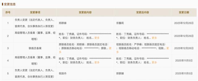 近日,国家企业信用信息公示系统显示,2025年12月26日,宏胜饮料集团有限公司(宏胜集团)由郑群娣变更为宗馥莉,联络员备案也由郑群娣变更为严学峰。高级管理人员备案方面,经理由郑群娣变更为宗馥莉,财务负责人丁秀娟、监事严学峰、董事宗馥莉未变。
