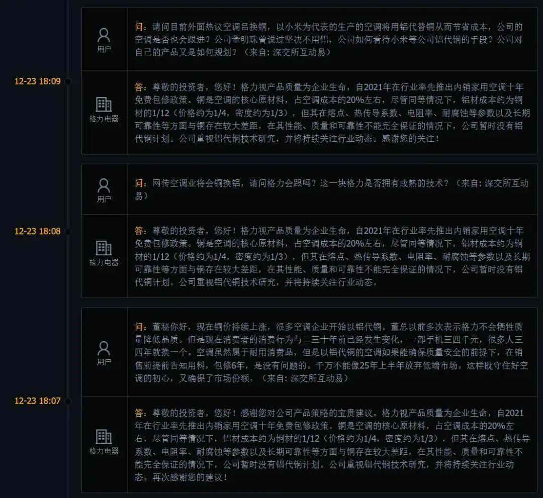 月底的时候,格力又在互动平台明确表示,公司暂时没有铝代铜计划。