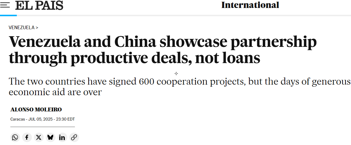 2025年7月25日,《ELPAIS》报道称,在5月举行的中国-拉美及加勒比国家共同体(CELAC)峰会,我们与委内瑞拉还签署超过多项双边协议,这种合作涵盖了科技、投资促进和农业发展等领域。