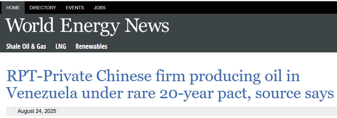 2025年8月24日,《世界能源新闻》报道称,中国私营企业在委内瑞拉罕见地签订了20年协议下生产石油。