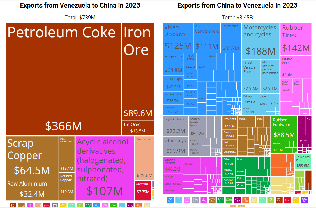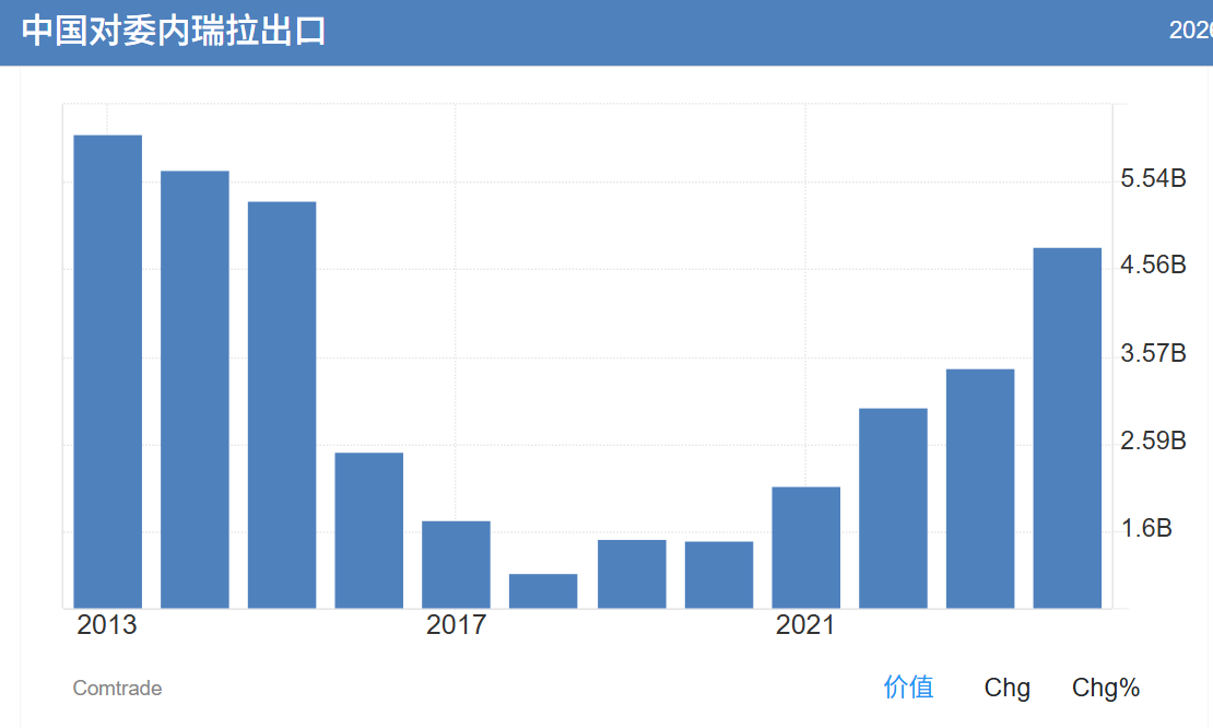 根据联合国COMTRADE国际贸易数据库,2023年,中国对委内瑞拉的出口额为34.5亿美元,委内瑞拉对中国出口约7.39亿美元。