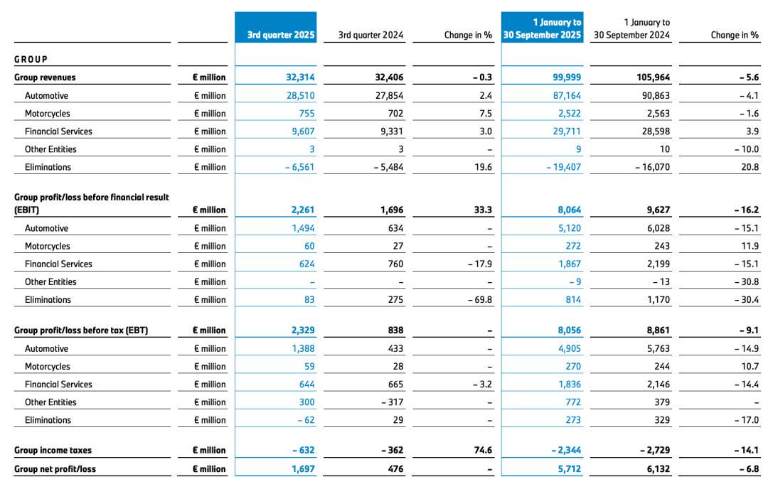 财报数据显示,2025年前三季度,宝马集团全球累计营业收入999.99亿欧元,同比下滑5.6%;其中汽车业务板块收入871.64亿欧元,同比下滑4.1%,税前利润同比降幅达9.1%。