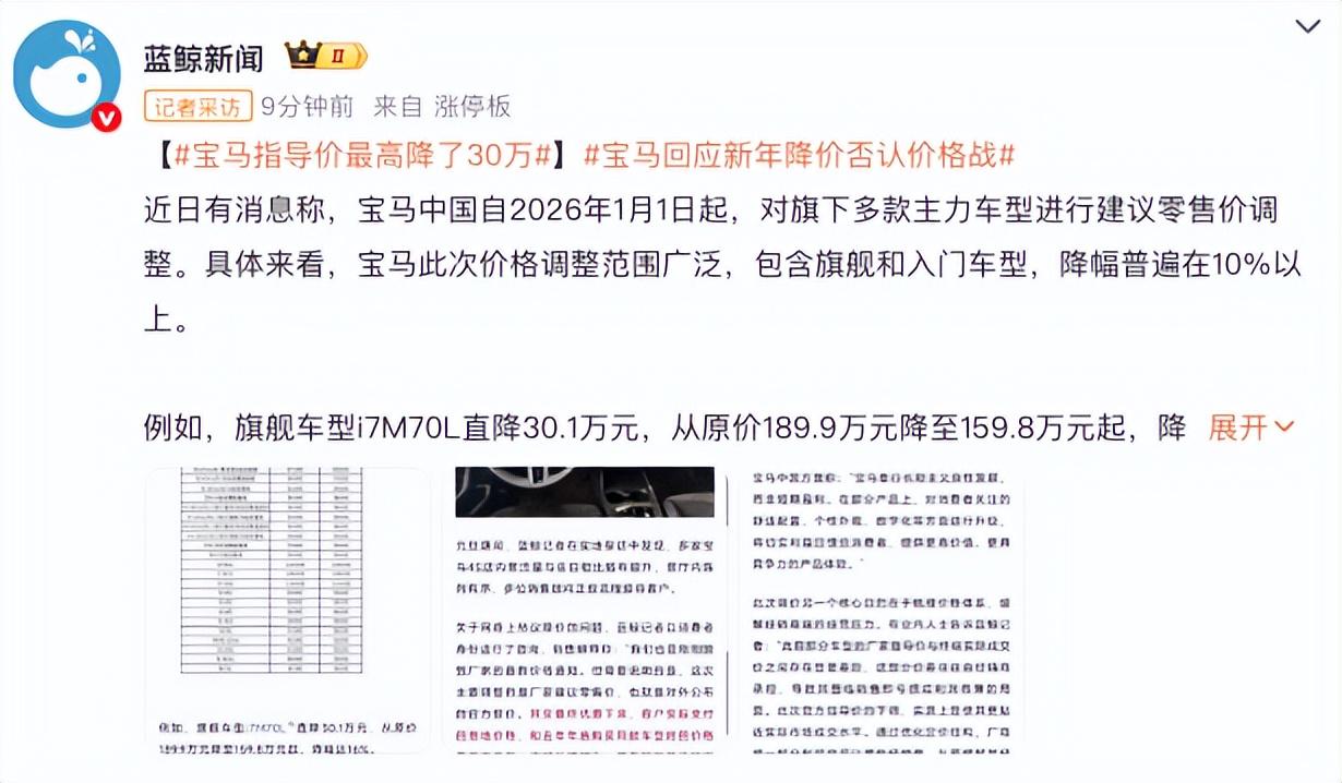 2026年1月1日,宝马中国打响豪华车市场新年调价第一枪,对旗下轿车、SUV、电动及高性能等多个品类的主力车型启动官方指导价调整,部分车型最高降幅超30万元,覆盖范围与降价力度均刷新近年豪华车市场纪录。