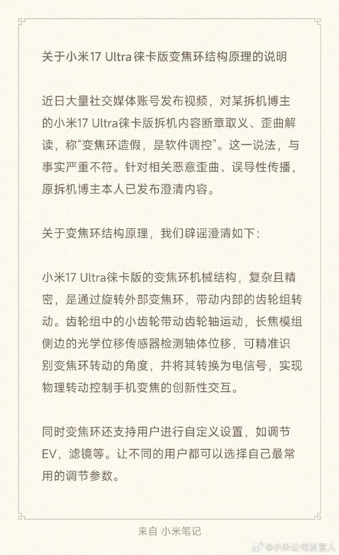小米表示,近日大量社交媒体账号发布视频,对某拆机博主的小米17 Ultra徕卡版拆机内容断章取义、歪曲解读,称“变焦环造假,是软件调控”。这一说法,与事实严重不符。针对相关恶意歪曲、误导性传播,原拆机博主本人已发布澄清内容。