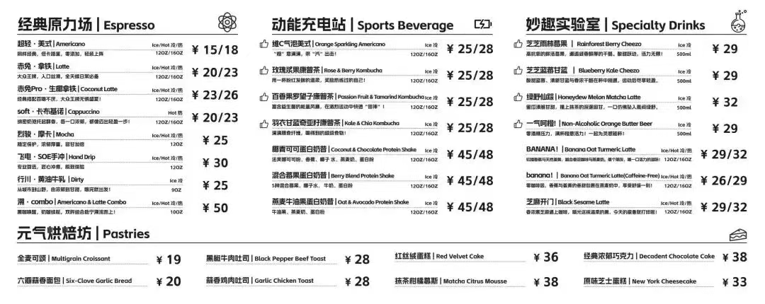 作为宁咖啡在全国开出的第9家店,宁咖啡超级奥莱店有了单独门头和独立客座区,且首次走进商圈。全新的渠道和门店场景,被业内人士认为是李宁开始将咖啡业务从体验补充升级为商业正餐的全新尝试。公开菜单显示,除了有借用李宁经典跑鞋系列的“赤兔·拿铁”“烈骏·摩卡”等咖啡饮品,还有如羽衣甘蓝奇亚籽康普茶、混合梅果蛋白奶昔等紧扣运动场景与健身理念的健康饮;除此之外,店内还可提供全麦可颂、黑椒牛肉吐司、原味芝士蛋糕等烘焙产品。除了超轻美式外,其饮品售价都在20元以上,而最贵的“潮·combo”双萃,10oz需要50元。