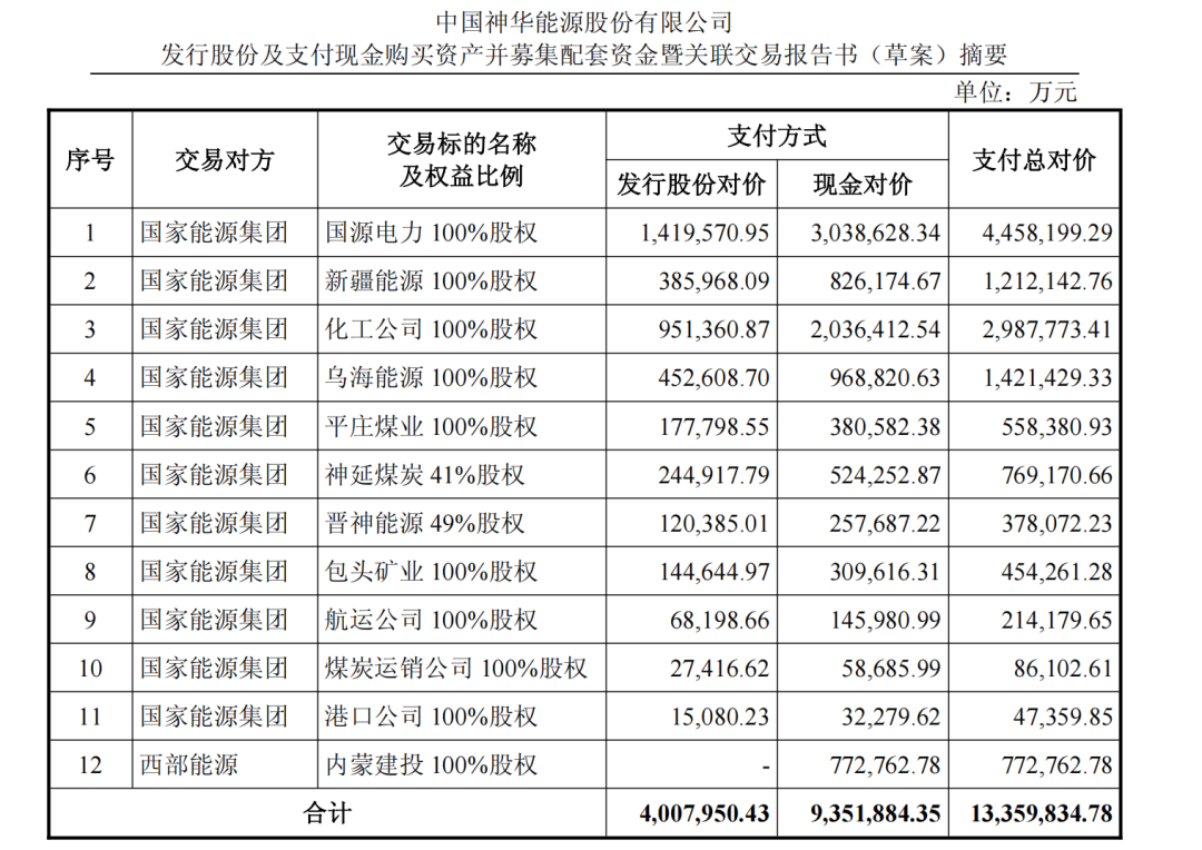 近日,中国神华发布公告,拟收购国家能源集团及其全资子公司西部能源持有的多项核心资产。这笔交易里,仅现金支付就高达935亿元,足以掏空账上中国神华账上四分之三的现金,而加上股份支付,总对价逼近1336亿元。