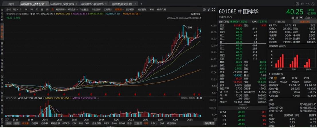 对应股价表现来看,2020年末,中国神华的股价(前复权)只有12.19元,随后一路攀升,到2024年10月最高冲到43.88元,即便后面有波动,最新股价依旧停在40元以上。