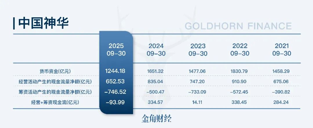 更关键的是,交易发生的时间点,并非现金流最宽裕的阶段。三季度末,中国神华账上现金1244.18亿元,而此次现金支付高达935.19亿元,掏空账上四分之三的现金储备,甚至超过2024年全年经营现金流净额。